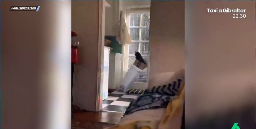 Cuando intenta salir se desequilibra y se cae, tirando la papelera. "Es capaz de meterse ahí dentro, donde seguramente ni quepa, pero saliendo es un inútil", comenta Alba Gutiérrezen el plató de Aruser@s tras ver el vídeo. Mientras que Hans Arús quiere creer que la caja en la que está el animal es la de una cama que le han comprado, pero prefiere tumbarse ahí en lugar de en la zona de descanso que le han preparado sus dueños.