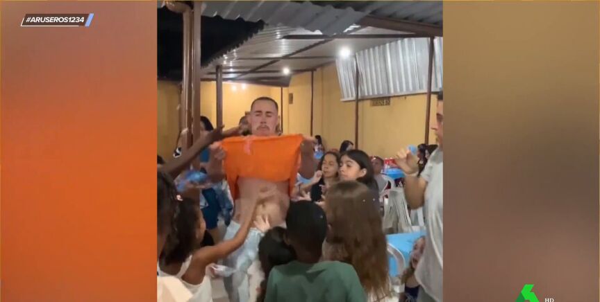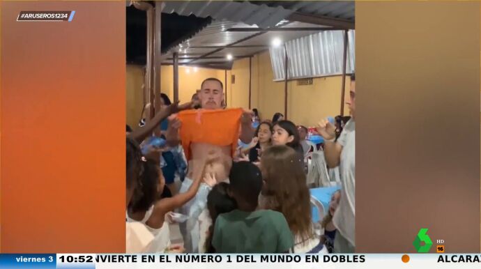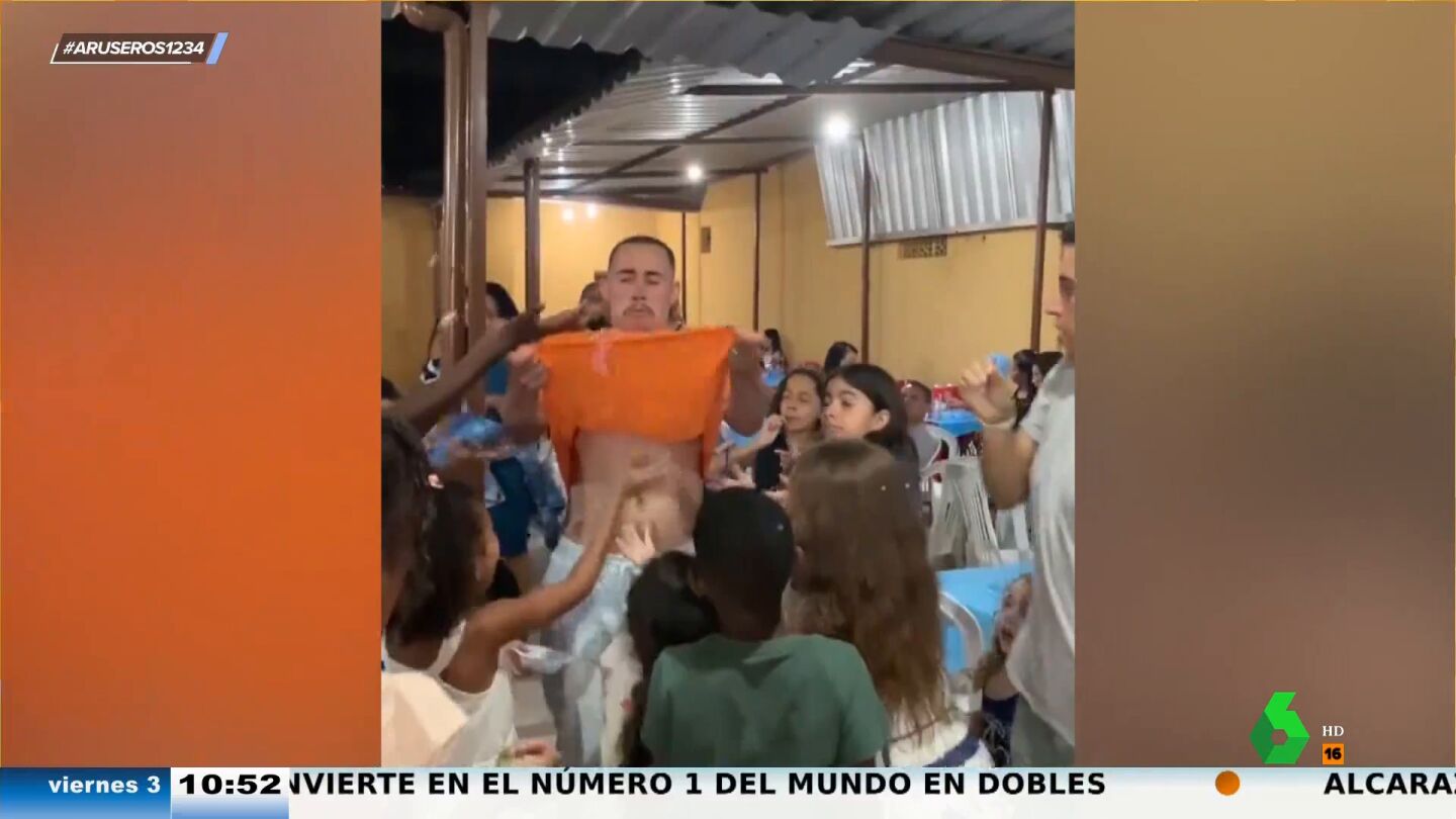 "Ha troleado a todos los niños", reacciona Alfonso Arús. El hombre se coloca debajo de un globo lleno de caramelos y cuando un adulto lo pincha, extiende su camiseta quedándose con casi todos los dulces y huye de la sala.