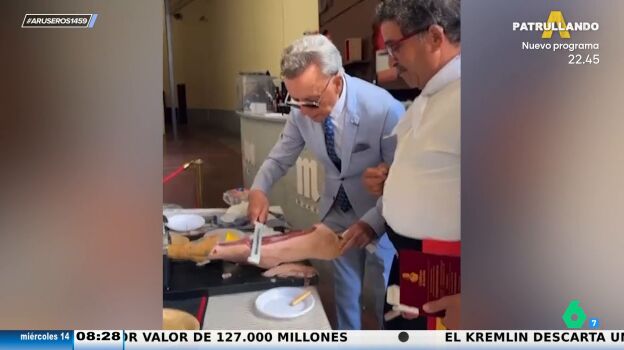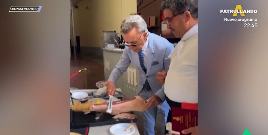"Ortega Cano se ha convertido en jamonero por un día, pero juraría que le falta un poco de práctica", explica Alfonso Arús al enseñar en el vídeo principal de esta noticia "el tajo que le ha pegado al jamón".