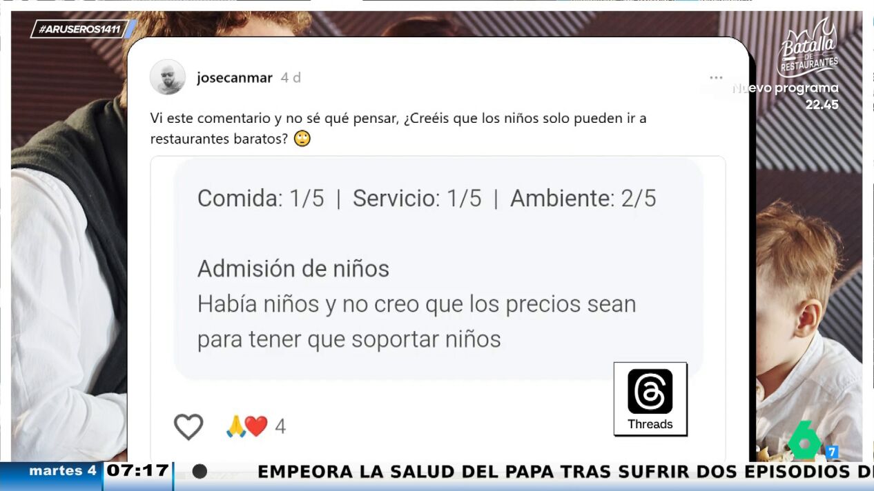 La reseña de un cliente acerca de un restaurante de lujo y bastante caro ha generado un interesante debate en las redes sociales y en el plató de Aruser@s. "Había niños y no creo que los precios sean para tener que soportarlos", reza este comentario. La pregunta que se hace Alfonso Arús y que lanza a sus colaboradores es sencilla: ¿Estamos más dispuestos a soportar a los niños ajenos si vamos a un restaurante económico que si comemos en uno caro? ¿En qué precio fijamos el límite para admitir o no a los niños?