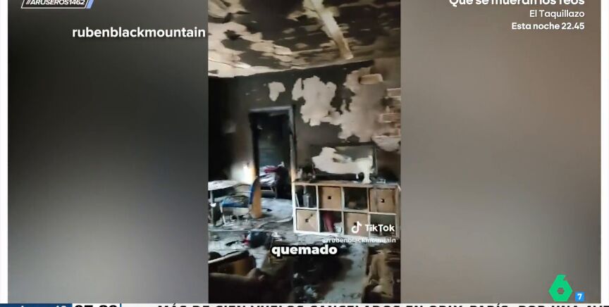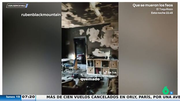 "Todo el piso está quemado, las habitaciones, las paredes. El incendio no ha dejado nada", describe mientras graba. "Pero vamos a ver algo muy característico y es que, si venimos por esta zona y abrimos esta puerta, que estaba cerrada, mirad cómo esta parte del piso queda totalmente intacta", dice mientras enseña una habitación completamente impoluta, sin rastro de humo ni llamas.