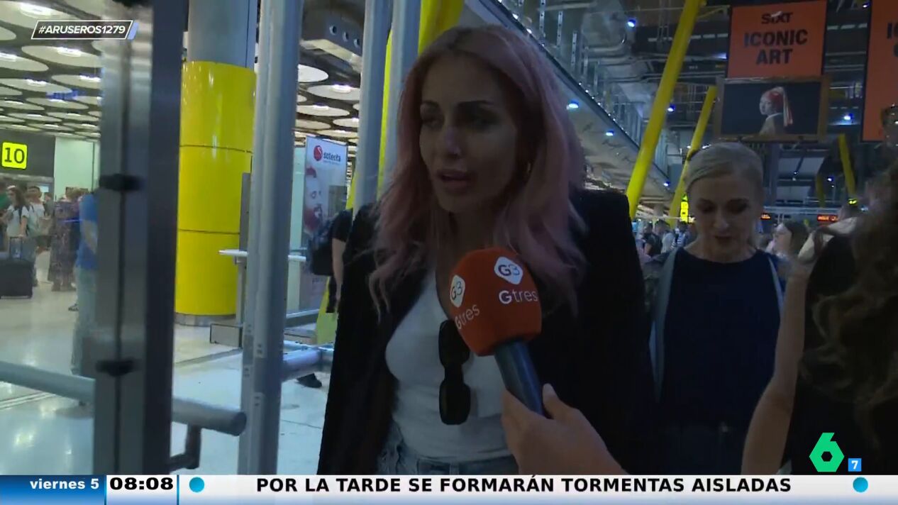 Hiba Abouk responde tajante a las preguntas de una reportera en un aeropuerto sobre su relación con Álvaro Muñoz Escassi tras la fiesta de 'El Turronero'. La actriz lo niega rotundamente ante la insistencia de la periodista.