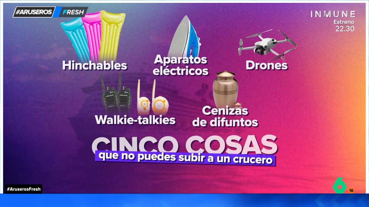 El tercer objeto son drones, que se pueden llevar a bordo pero no utilizarlos en el barco. El cuarto objeto son los walkie-talkies o sistemas de vigilancia para bebés, porque pueden causar interferencias en las comunicaciones del capitán del crucero. Por último, están permitidas, pero con restricciones, las cenizas de difuntos, que se pueden subir para echarlas al mar, pero con cuidado de que no terminen por el viento en la piscina del barco o encima de alguien.