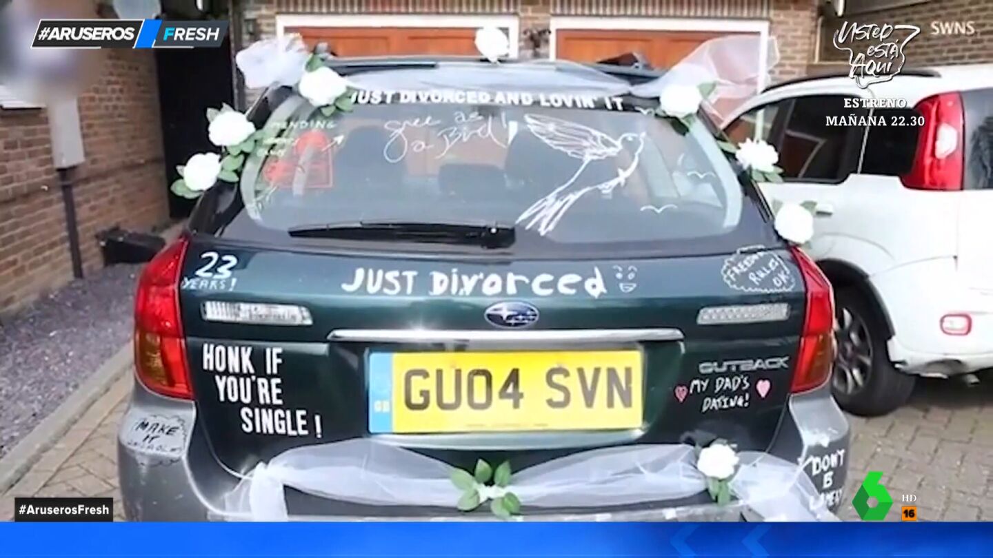 "Recién divorciado", "pita si estás soltero", "libre como un pájaro". Son algunos de los mensajes que pueden leerse en el coche de este hombre de 58 años que celebra su primer día de divorcio, tras 23 años casado, paseando por las calles de su pueblo a bordo de este peculiar vehículo.