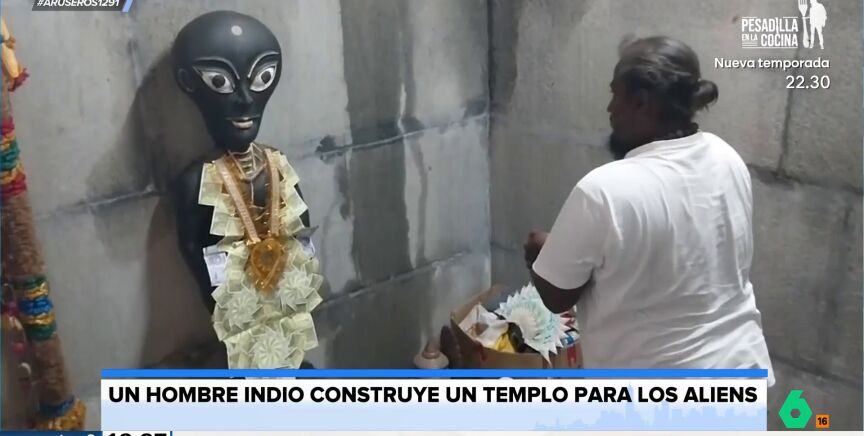 "Según el hombre, al estilo Carlos Jesús, ha recibido un mensaje de unos 'aliens' para que lo construya y asegura que son seres que buscan hacer el bien", explica Alfonso Arús mientras enseña las imágenes del hombre que ha construido un templo subterráneo dedicado a los extraterrestres.
