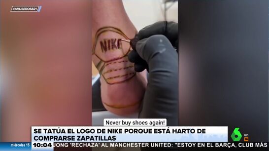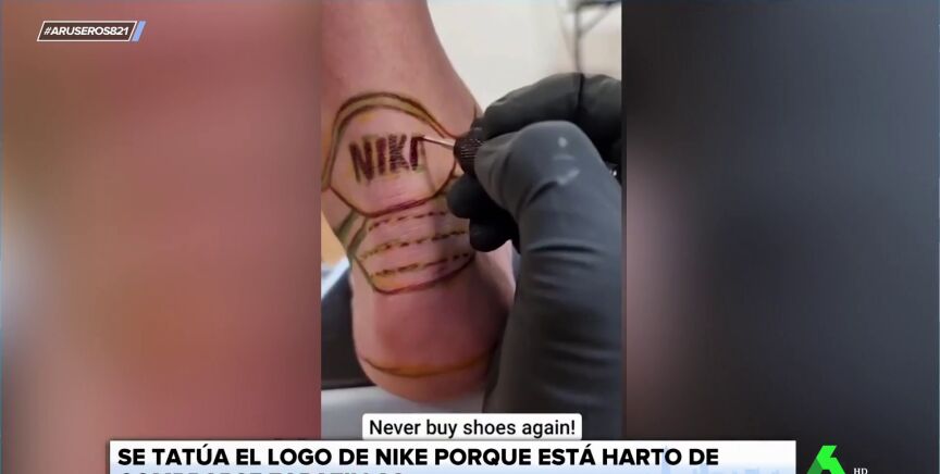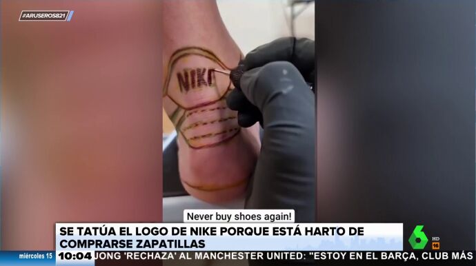 El protagonista de este vídeo viral mostrado en Aruser@s ha tenido una original idea. Para poder llevar siempre unas Nike Air Jordan sin tener que realizar un gran desembolso, ha decidido tatuarse la forma de la zapatilla en los pies. Con esfuerzo, su tatuador ha logrado reproducir la forma de este calzado utilizando tinta, aunque el resultado final no ha convencido a los colaboradores del programa.