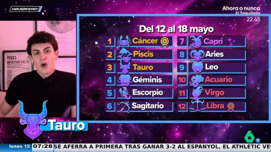 En el puesto mágico está Capricornio, quien recibirá un dinero que no espera. "Eso sí, mucho cuidado, porque la semana que viene se viene un gasto inesperado", advierte el experto. Aries esta semana estará melancólico y Leo, en cambio, con mucho ímpetu y sin poder estar quieto.