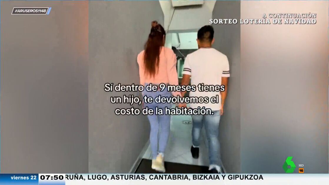 Algo muy útil si estás buscando de verdad un bebé, apunta la colaboradora María Moya. El anuncio de este hotel mexicano no tiene desperdicio, como podemos ver en el vídeo principal de esta noticia. La banda sonora está a la altura del evento. "Dale, dale candela", se oye cantar de fondo.