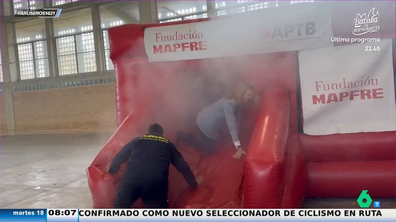"Después participa en una maniobra aún más compleja como es desalojar la casa", asegura la colaboradora de Aruser@s, que enseña en el vídeo cómo la hermana del rey Felipe baja por un tobogán hinchable. "La caída por la rampa es mejorable", destaca Alfonso Arús en el plató, donde Marc Redondo alucina al ver cómo la infanta Elena "baja haciendo la croqueta".