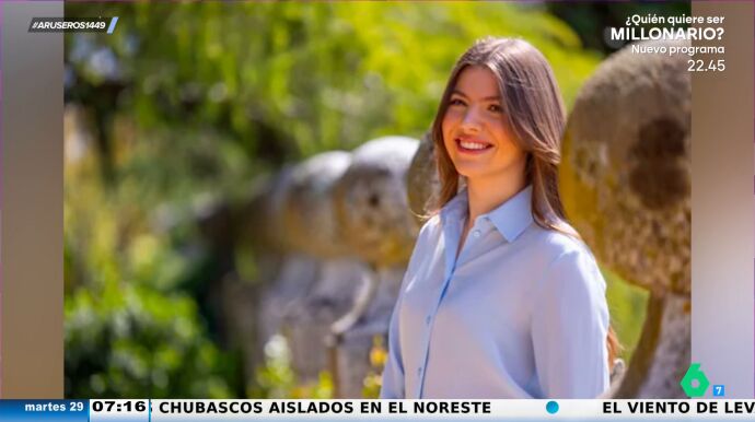 Tatiana Arús enseña en el vídeo principal de esta noticia las cinco fotografías nuevas de la infanta Sofíaque ha difundido Casa Real por su 18 cumpleaños. En ellas, la hija menor de los reyes de España aparece sonriente posando a cámara en los jardines de Zarzuela durante un soleado día.