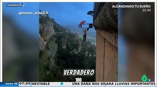A casi cien metros de altura, Gero Arias, un creador de contenido argentino, se ha colgado del Puente Nuevo de Ronda (Málaga) para realizar 300 dominadas, dentro del reto viral que está llevando a cabo.
