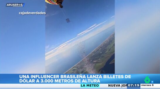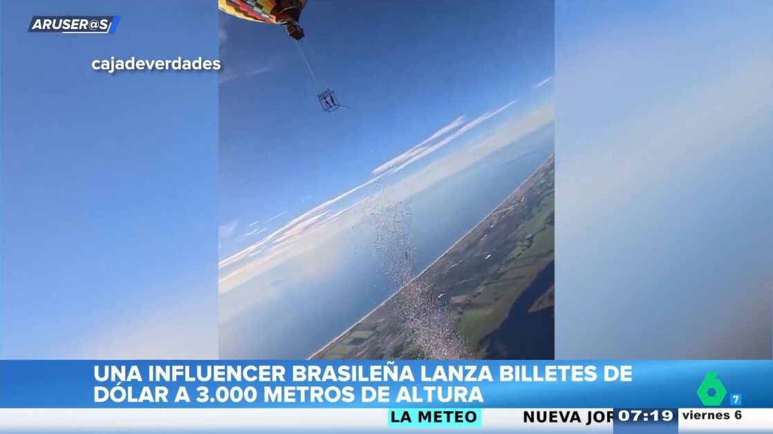 Una jaula de cristal, un globo aerostático y miles de dólares cayendo desde el cielo. Así es el último y arriesgado reto de Sara Vidal, una influencer brasileña.