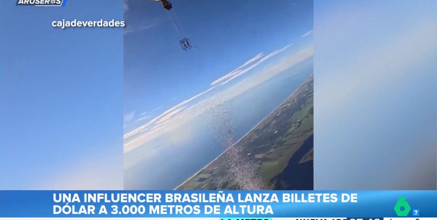 "La brasileña es especialista en realizar retos extremos totalmente controlados", comenta la tertuliana, que detalla la espectacular puesta en escena. Sara se introdujo en una jaula de cristal de metacrilato, colgada de un globo aerostático y suspendida a más de 3.000 metros de altura. Desde allí, se abrió la base para dejar caer los billetes y, acto seguido, se lanzó al vacío.