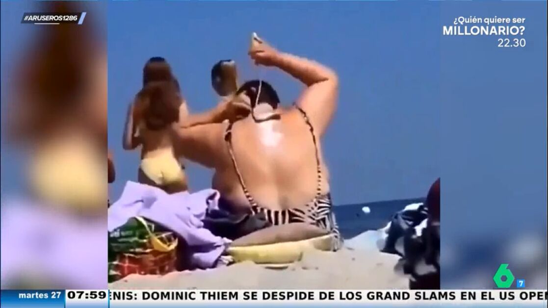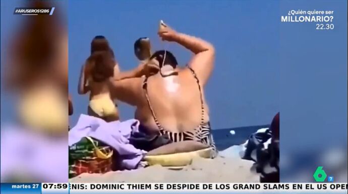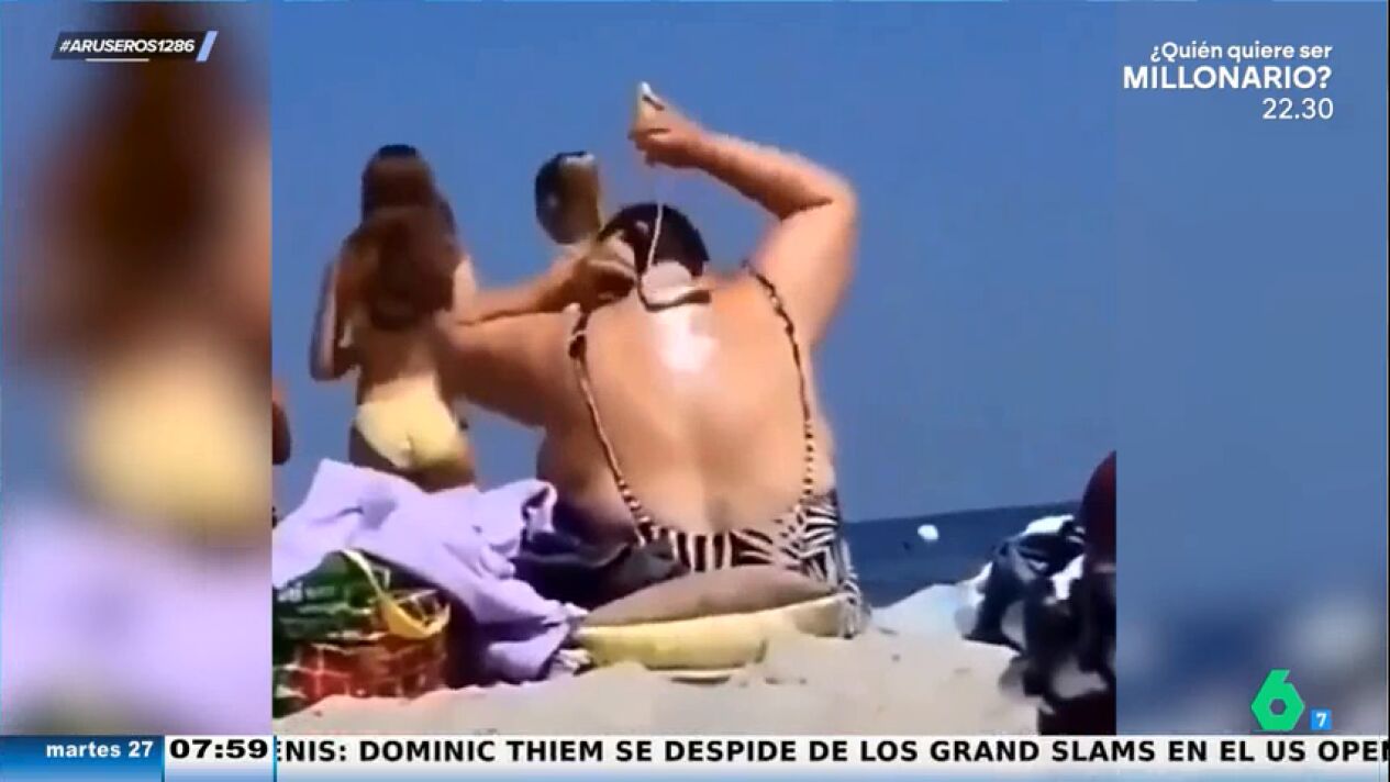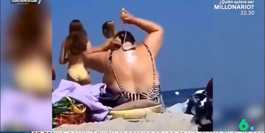 "Los expertos insisten en que es muy importante echarse la crema solar, también en la espalda. Esta mujer ha encontrado la solución perfecta para extender la crema sin ayuda", explica Alfonso Arús para mostrar el viral en el plató. En las imágenes podemos ver cómo una señora se extiende la crema por toda la espalda con un rodillo, una zona del cuerpo a la que sin ayuda sería imposible distribuir de manera uniforme.