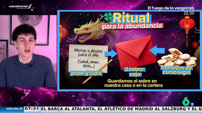 Se trata del ritual de los sobres rojos. "Vamos a necesitar un sobre rojo, papel en blanco y monedas o billetes de curso legal. En el caso de España, el euro", advierte. En el papel en blanco tenemos que escribir propósito en presente. "Es decir, 'tengo amor', 'tengo dinero', 'tengo estabilidad'. Aunque no los tengas, hay que ponerlo siempre en presente", explica.