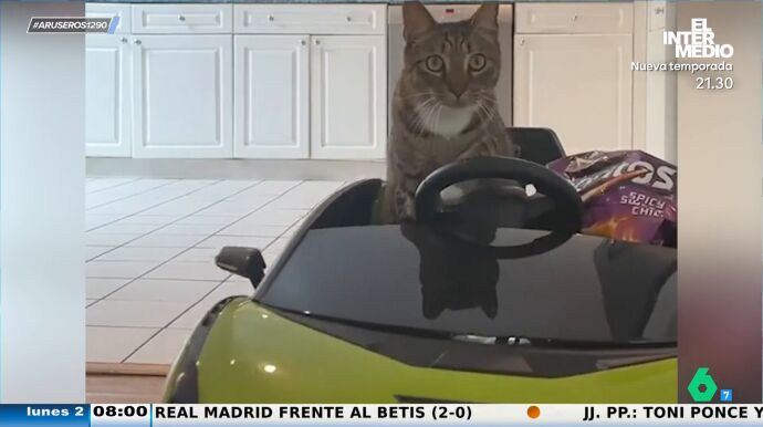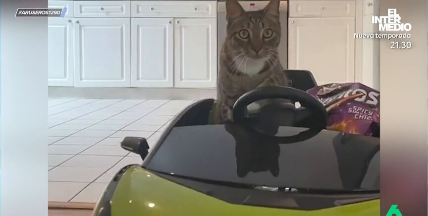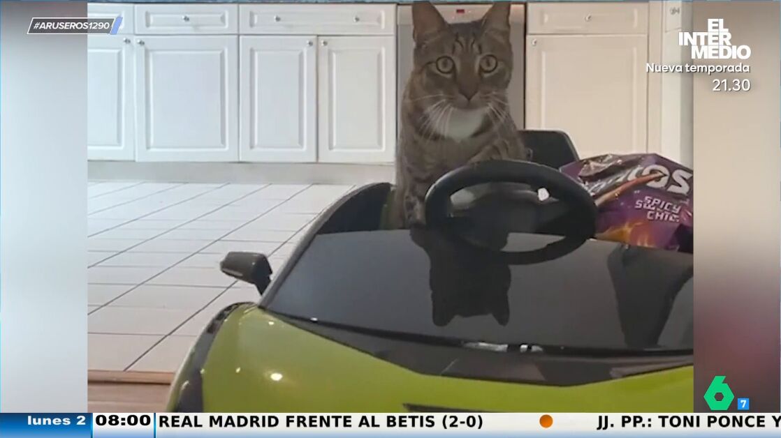 Como podemos ver en las imágenes el felino se sube a la encimera de la cocina, abre la puerta de la despensa, se mete dentro y saca de ahí una bolsa de patatas. Agarra la comida con la boca y de un salto cae en un coche de juguete eléctrico que le está esperando aparcado. Como si fuera James Bond, el gato se larga de la cocina victorioso y con su botín.