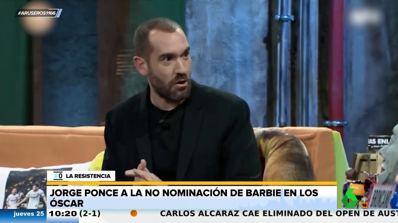 La actriz Margot Robbie , al igual que la directora Greta Gerwig, las mujeres que hicieron que 'Barbie' fuera un gran éxito de taquilla en 2023, no han conseguido sus respectivas nominaciones al Oscar por dirección ni actriz principal. Jorge Ponce se muestra muy indignado en el plató de La Resistencia, donde critica esta decisión: "La película Barbie ha nominado a Ken". "¿No han nominado a Margot Robbie?", pregunta alucinado David Broncano a Jorge Ponce, que contesta tajante: "No, han nominado a Ryan Gosling, dos nominaciones, una por cada cojón".