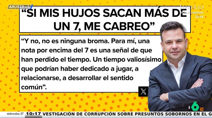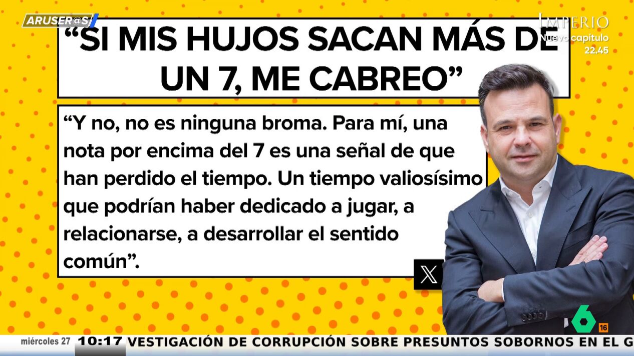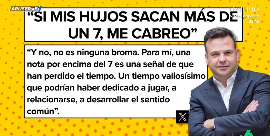 "Si mis hijos sacan más de un 7 en el colegio, me cabreo. Y no, no es ninguna broma", asegura José Elías en su cuenta de X (antes Twitter). Sus declaraciones son recogidas por Alfonso Arús en Aruser@s en la sección de los 'zascas' y en ellas critica el sistema educativo de nuestro país.