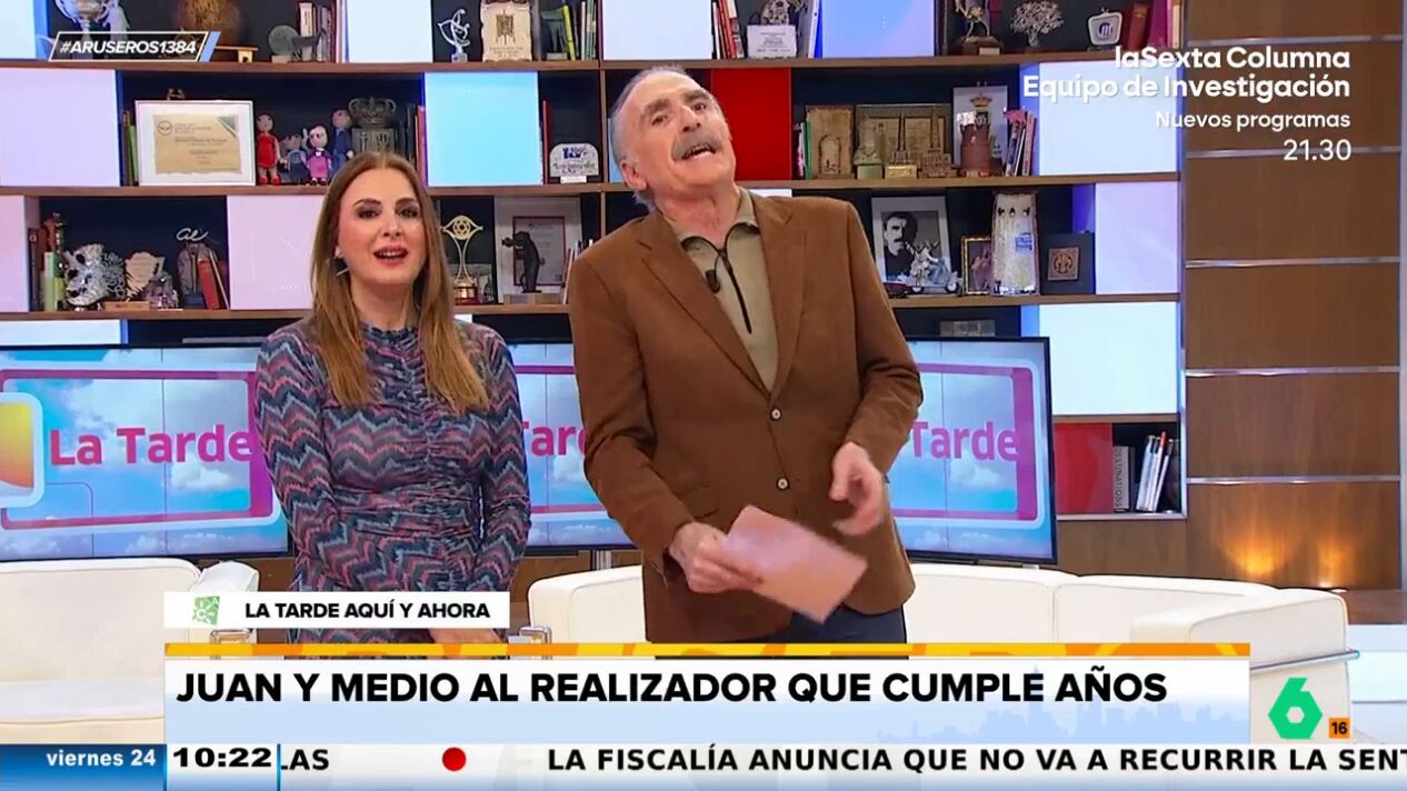 Juan y Medio felicita a Mario, el realizador de 'La tarde aquí y ahora', por su cumpleaños, sin embargo, cuando le ve con un micrófono en la mano, el presentador no puede evitar trolearle en este vídeo.
