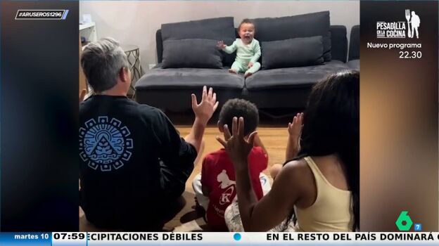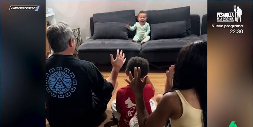 Si él aplaude, ellos aplauden. Si él ríe, ellos ríen. Este divertido vídeo viral emitido en Aruser@s nos enseña cómo se juega a imitar al bebé. El resultado de tan divertido pasatiempo en familia es desternillante.