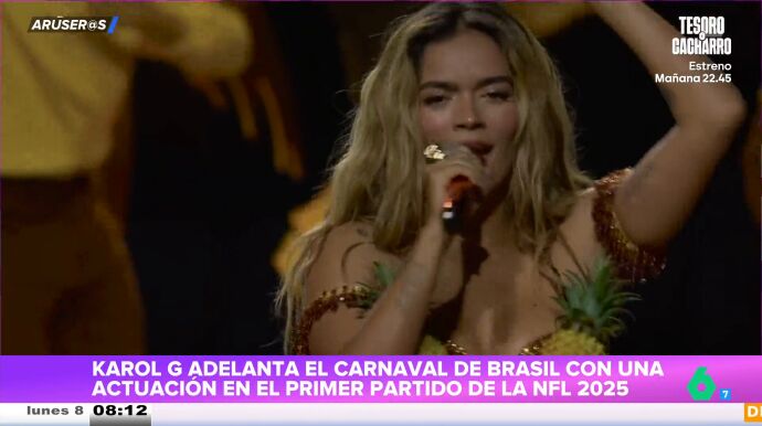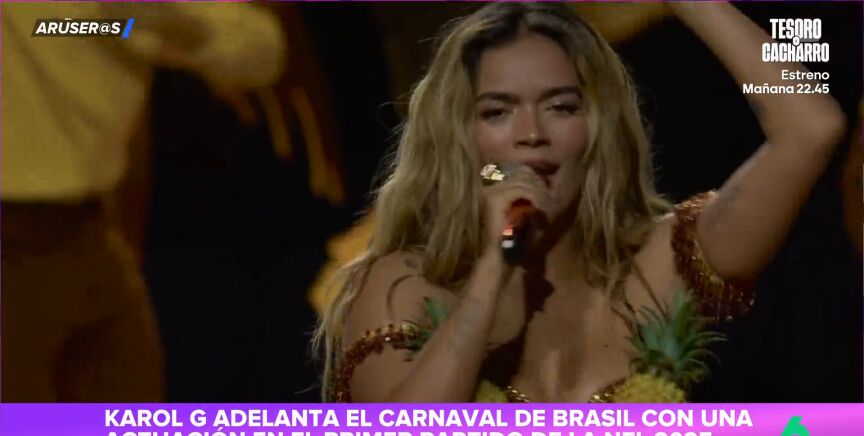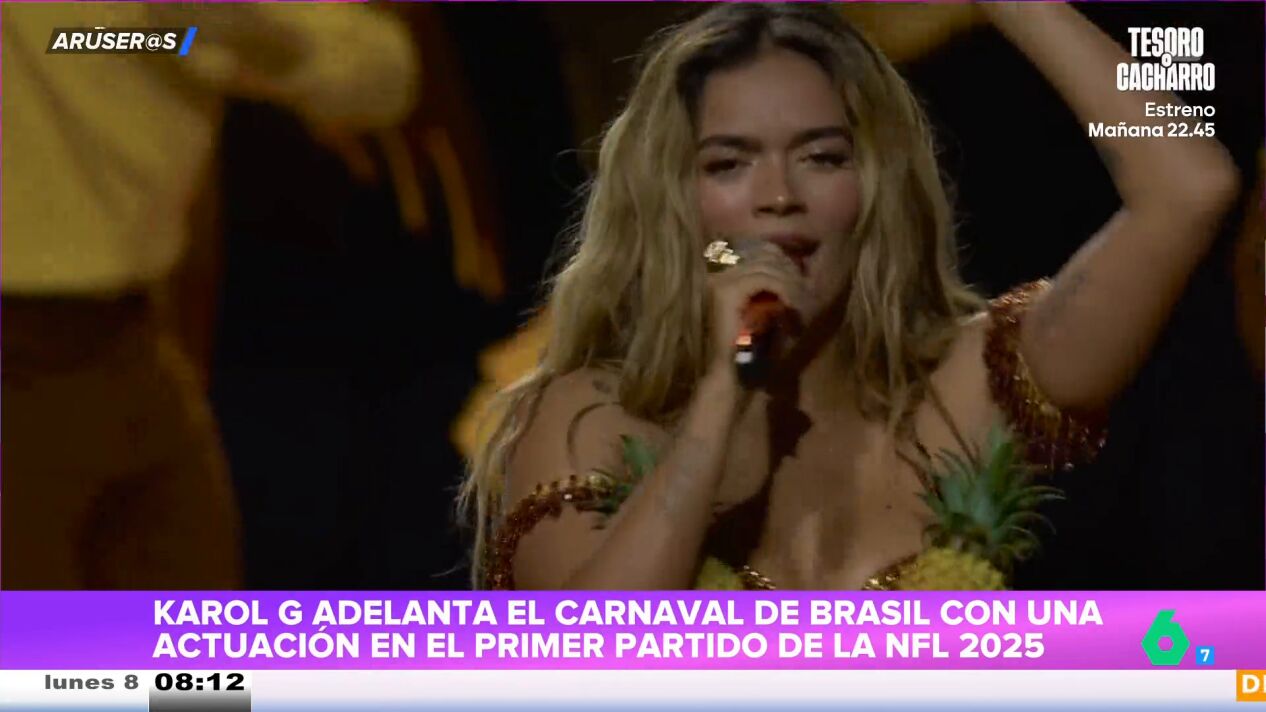 "Karol G se ha adelantado al Carnaval de Brasil con una actuación", destaca Alfonso Arús en el plató de Aruser@s, donde Tatiana Arús enseña el momentazo. Y es que la artista colombiana ha actuado en el descanso del partido de la NFL en el que se enfrentaban los Kansas City Chiefs y Los Angeles Chargers y que daba arranque a la temporada.