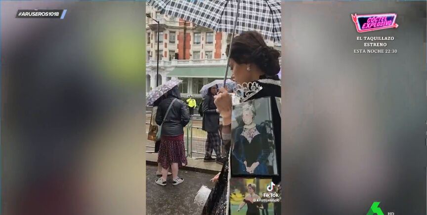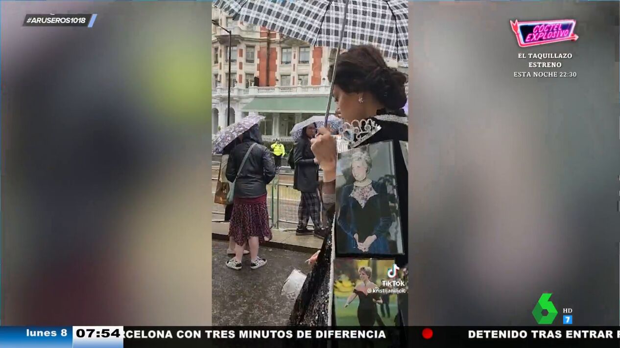 Se trata de una mujer que acude al acto con un vestido en el que aparecen rostros tan conocidos como Meghan Markle, Lady Di o la reina Isabel II. "Está muy acertado porque además te combina con todo", destaca Tatiana Arús, que explica que "los brillos son tendencia".