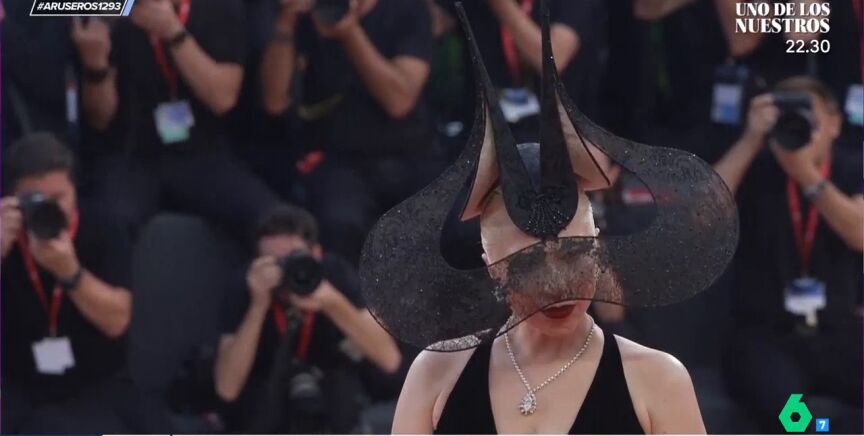 Lady Gaga no deja a nadie indiferente con su look en la presentación de su última película, Joker, en el Festival de Venecia. La actriz y cantante apuesta por un diseño de Dior con una especie de corsé con una falda maxi volumen plisada. "Lo combinó con un tocado excéntrico con unos cuernos que me recuerdan más a Maléfica que a Harley Quinn", afirma Tatiana Arús, en referencia al personaje de la actriz en la película.