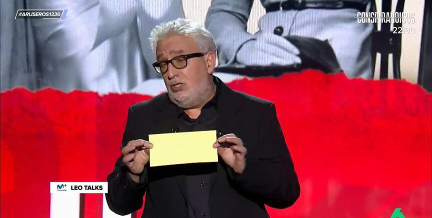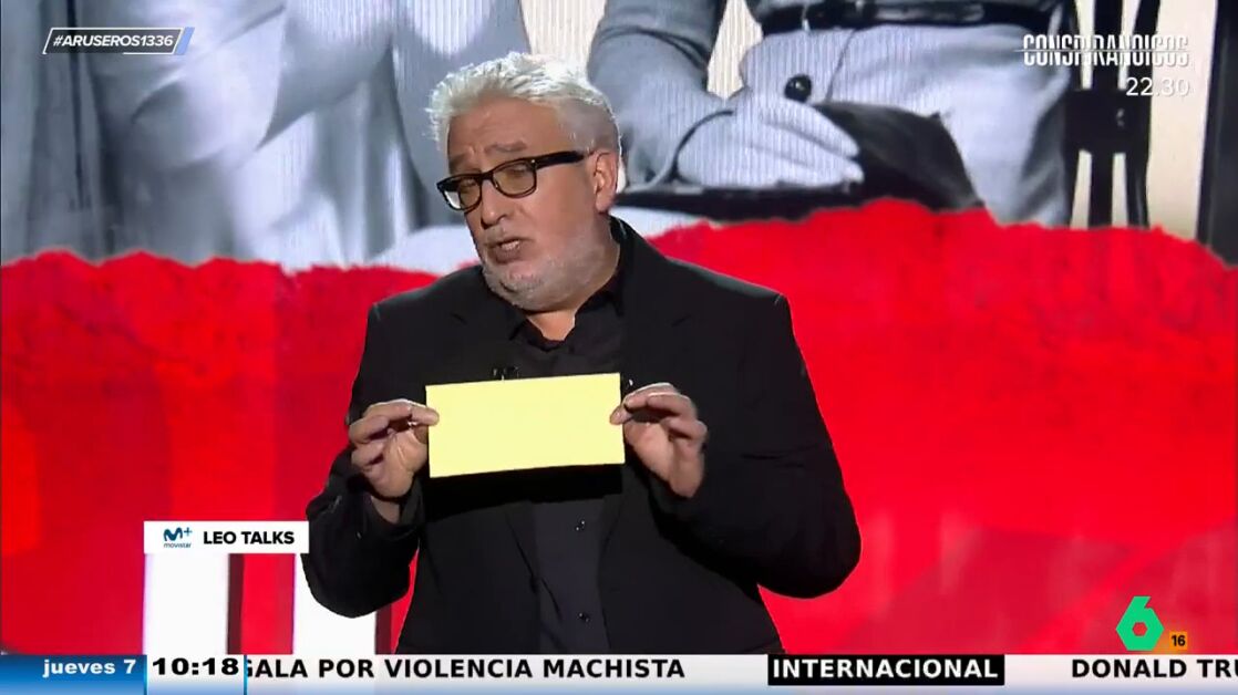 Hans Arús enseña en el plató de Aruser@s el monólogo de Leo Harlem sobre las invitaciones de boda en 'Leo Talks'. "Imaginaos que os llega este sobre a casa, ¿qué os gustaría que hubiera dentro? ¿una multa de tráfico o una invitación de boda?", pregunta Leo Harlem, que pide que el público levante un palo dependiendo de su respuesta.
