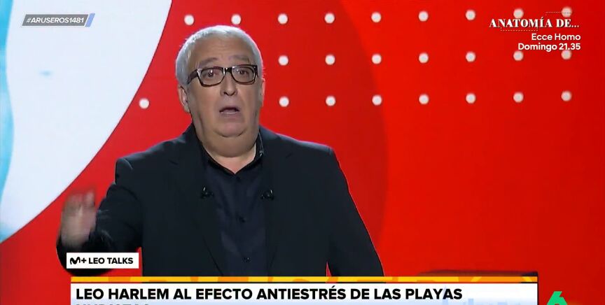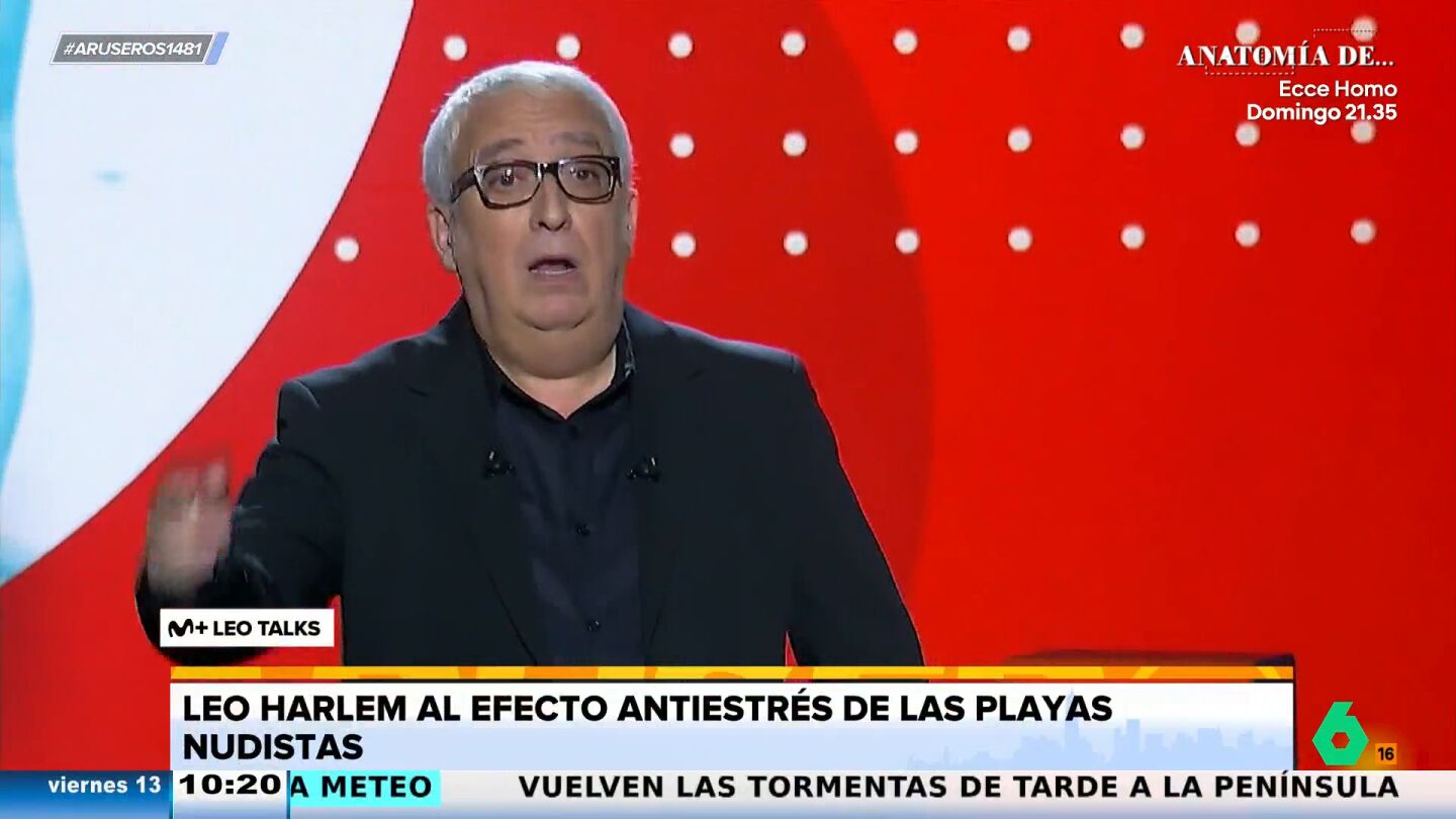 No es la primera vez que Leo Harlem expone su cómica opinión sobre hacer nudismo en las playas. Esta vez, Alfonso Arús recoge en la sección de 'zasqueadores' lo que ha comentado el humorista, en su show 'Leo Talks', sobre el efecto antiestrés de las playas naturistas.
