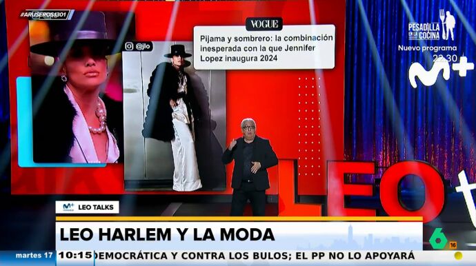 "La diferencia es que Jennifer Lopez se planta un pijama y un sombrero y le queda fetén, me pongo yo eso y soy una botella del Tío Pepe", bromea Leo Harlem. Por su parte, desde el plató de Aruser@s todos los colaboradores le dan la razón: "Es el mérito de las estrellas, que todo les queda bien".