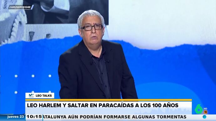 Alfonso Arús comenta que en el programa han hablado varias veces de las personas ancianas que saltan en paracaídas para dar paso a un vídeo de Leo Harlem. El cómico critica el espíritu juvenil de muchas personas mayores para hacer algunas actividades. "Por mucho espíritu juvenil que tengas, hay actividades físicas que no están hechas para gente mayor", expone el humorista, que es interrumpido por una inteligencia artificial que dice: "Eso díselo a Irene O'Shea, una australiana de 102 años, la persona con más edad en saltar en paracaídas".