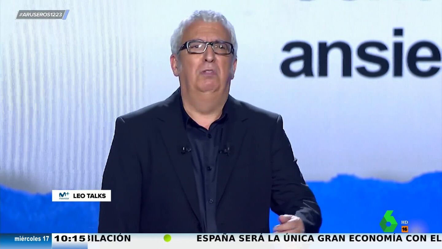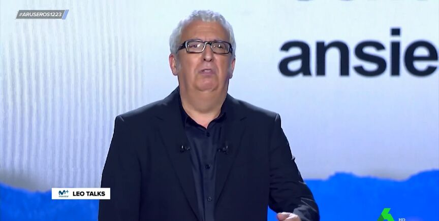 Alfonso Arús enseña en el plató de Aruser@s el divertido monólogo de Leo Harlem sobre el uso del móvil por parte de los jóvenes. Tras conocer que más de la mitad de la Generación Z usa sus teléfonos inteligentes cinco o más horas al día. "¿Cinco horas al día?, yo no uso tanto tiempo ni los calzoncillos", afirma Leo Harlem, que se pregunta qué están haciendo esas cinco horas "si no contestas nunca cuando les llamas".