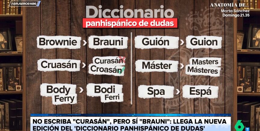 En Aruser@s se comentan algunas palabras que parece que van a ser muy útiles para evitar equivocaciones. Entre ellas se encuentran espá (de spa), brauni (de brownie), bodi-ferri (de body-ferry), másters o másteres (del plural de máster), croasán (de cruasán) y la palabra guión, cuya versión sin tilde (guion), también está recogida.