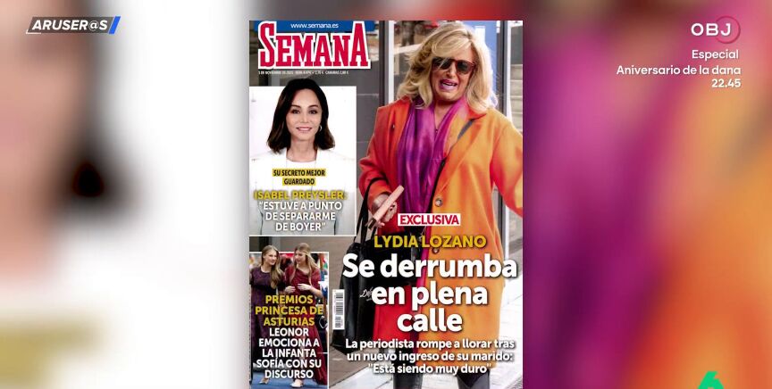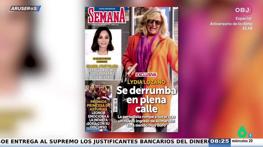 Como cada miércoles, Alfonso Arús enseña junto a Tatiana Arús las portadas más llamativas de las revistas del corazón. Es el caso de la revista 'Semana', donde aparece la periodista Lydia Lozano, "que se derrumba en plena calle" tras el nuevo ingreso del marido.