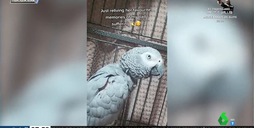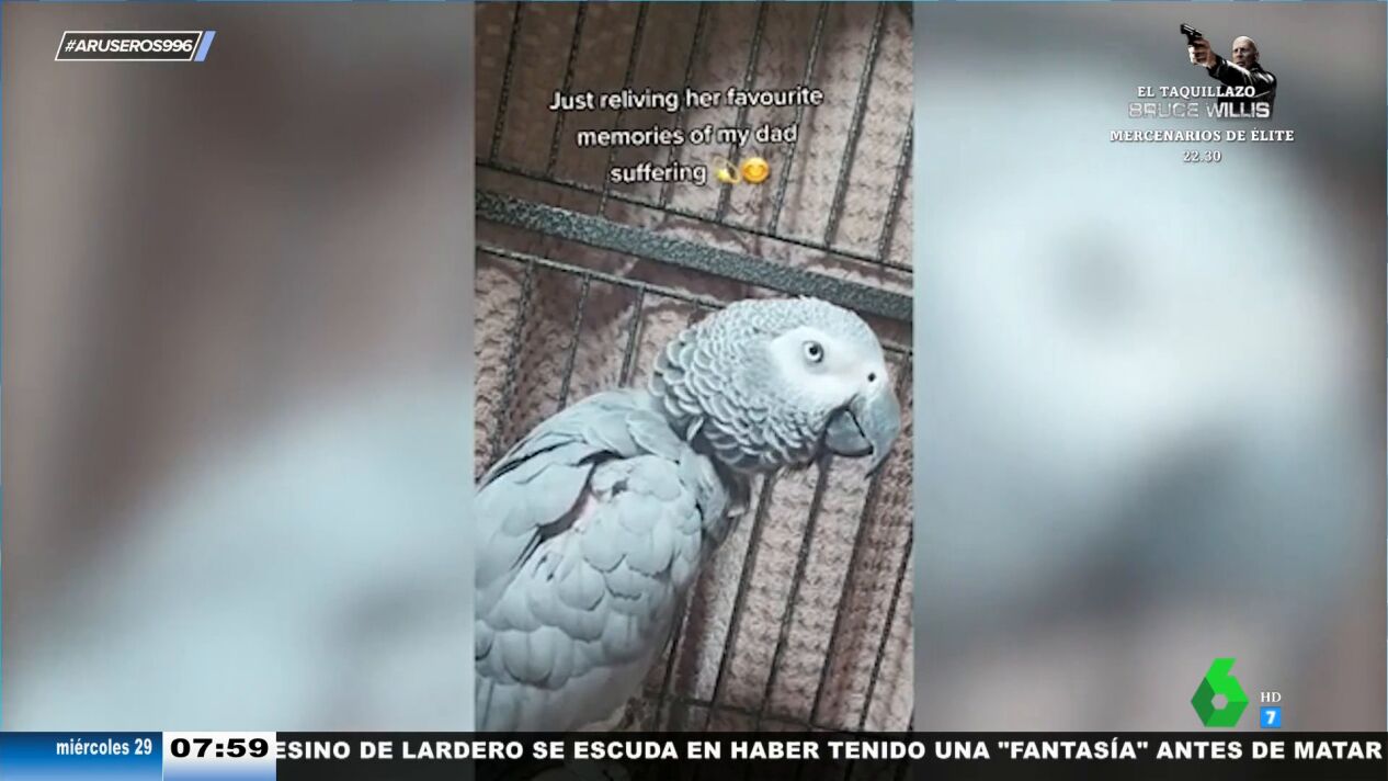 Aunque pueda parecer que el sonido que se escucha en el vídeo principal de esta noticia proviniera de un señor mayor tosiendo, lo cierto es que procede de un loro, que no hace otra cosa que imitar a su dueño. El anciano tiene una enfermedad pulmonar que le provoca ataques de tos y su mascota, lejos de darle cariño, se burla de él remedándole, tal y como vemos en este vídeo viral emitido en Aruser@s.
