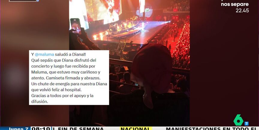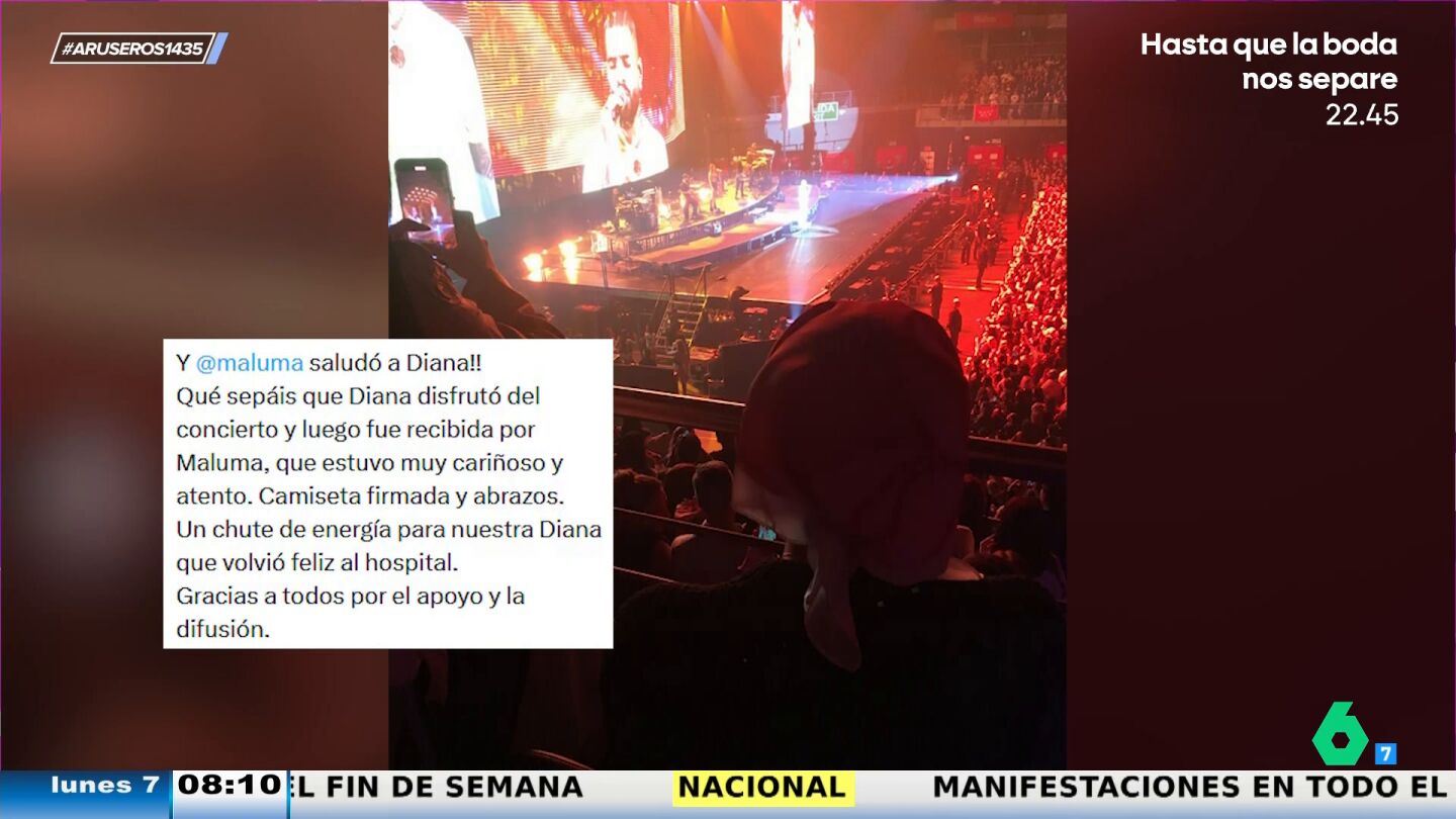 El caso llegó hasta el propio Maluma, que la ha invitado al backstage, donde le ha firmado un autógrafo y se ha abrazado con ella. "Buen detalle", destaca Alfonso Arús. Desde el entorno de Diana aseguran que Maluma "estuvo muy cariñoso y atento" con la joven y que para ella "fue un chute de energía" antes de volver al hospital.