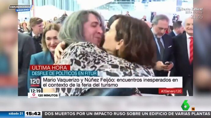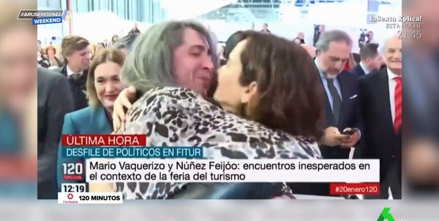 Fitur, la feria de Turismo de Madrid, está dejando varios encuentros curiosos que este sábado han destacado desde Aruser@s Weekend. Además del de Paz Padilla e Iván Espinosa de los Monteros, los colaboradores han comentado el efusivo saludo de Mario Vaquerizo e Isabel Díaz Ayuso. "Este es en el que más contacto hay, el que más dura, barriga con barriga pecho con pecho", comentaba Tatiana Arús. Como se puede ver en el vídeo que acompaña a la noticia, sin duda algun han estado a punto de darse un beso.