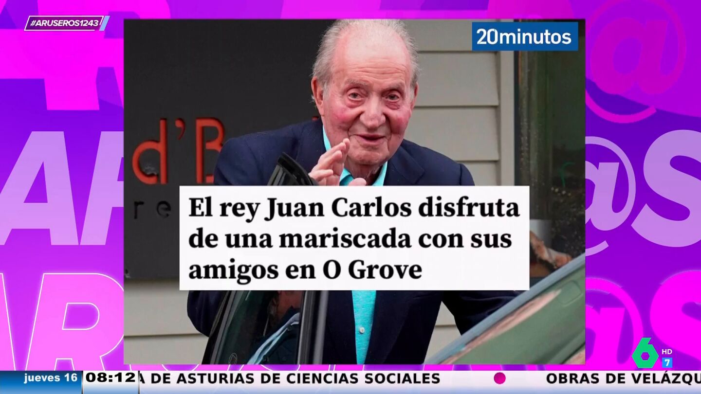 "Recién aterrizado en España, el rey no salió a navegar pero sí disfrutó de una copiosa mariscada en O Grove", destaca Tatiana Arús, que afirma que la comida "duró más de tres horas y media". "Como debe ser", afirma Alfonso Arús, que destaca que "después viene el licor de hierbas o el orujo casero".
