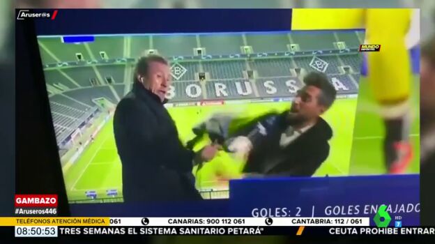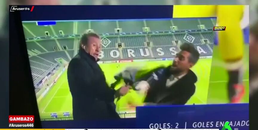 Las conexiones en directo y al aire libre siempre presentan sus riesgos. Es el caso de lo que le ha pasado a Jorge Valdano. El extécnico blanco estaba comentando con José Sanchís el encuentro de Champions entre el Borussia Mönchengladbach y el Real Madrid cuando sufrió un accidente que interrumpió su análisis.