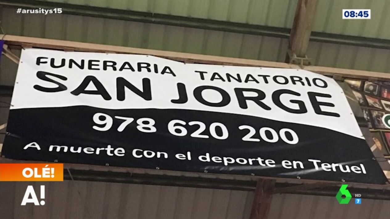 Alfonso Arús comparte la astuta idea de una funeraria para mostrar su apoyo al estadio de fútbol que ha patrocinado. Los colaboradores de Arusitys muestran su aprobación por el cartel que, en blanco y negro, exhibe un 'A muerte con el deporte de Teruel'.