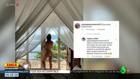 Nagore Robles ha revolucionado las redes sociales con una fotografía espectacular desnuda en Bali. Una imagen que no ha todo el mundo ha gustado y por la que una usuaria le ha tachado de "cerda". En este vídeo puedes ver la aplaudida respuesta de la televisiva.