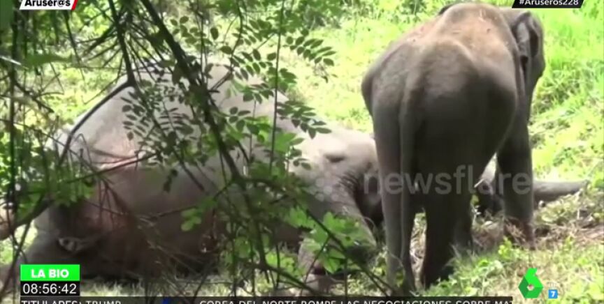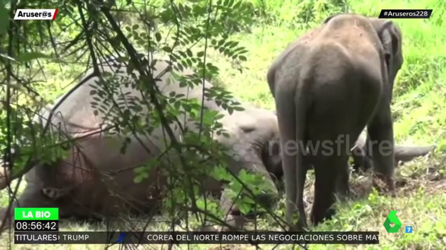 En las imágenes se ve cómo el pequeño animal toca con su trompa a su progenitora, en busca de alguna señal de vida, pero no obtiene respuesta.