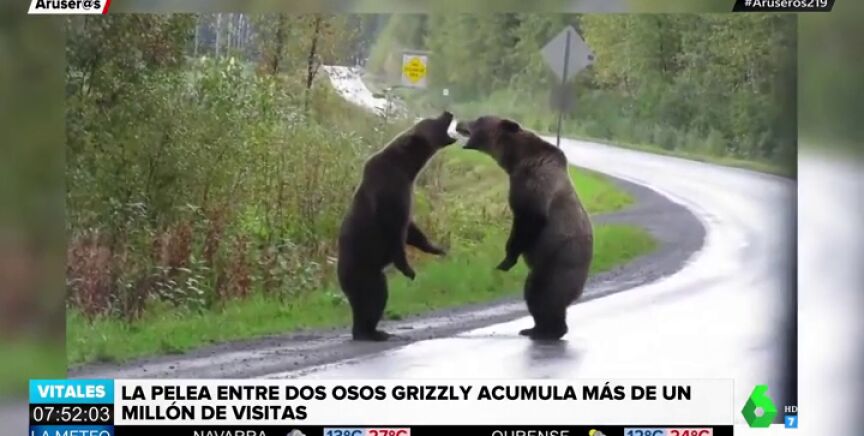 Una mujer graba con su teléfono móvil la lucha entre dos osos grizzly que se han enfrentado en medio de una carretera de Columbia. Este es el vídeo del momento.