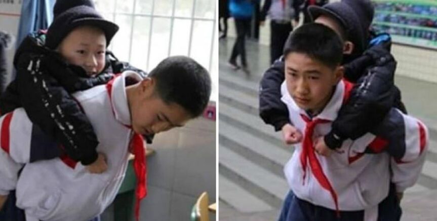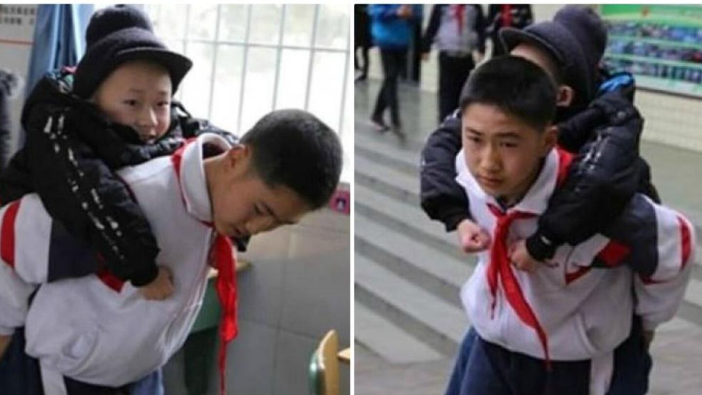 La tierna historia de Xu, el niño que carga todos los días con su amigo con discapacidad para ir al colegio