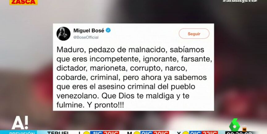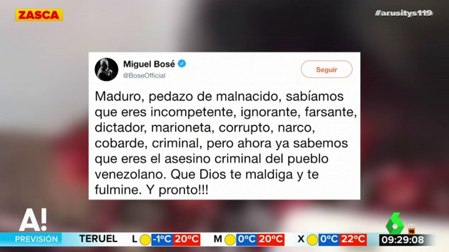 Ante la negativa de Maduro a dicha entrada, Miguel Bosé lanzó un duro mensaje desde su cuenta de Twitter contra él: "Maduro, pedazo de malnacido, sabíamos que eres un criminal, pero, ahora, ya sabemos que eres e asesino criminal del pueblo venezolano. que dios te maldiga y te fulmine, y pronto". Puedes ver el mensaje completo en el vídeo de Arusitys.