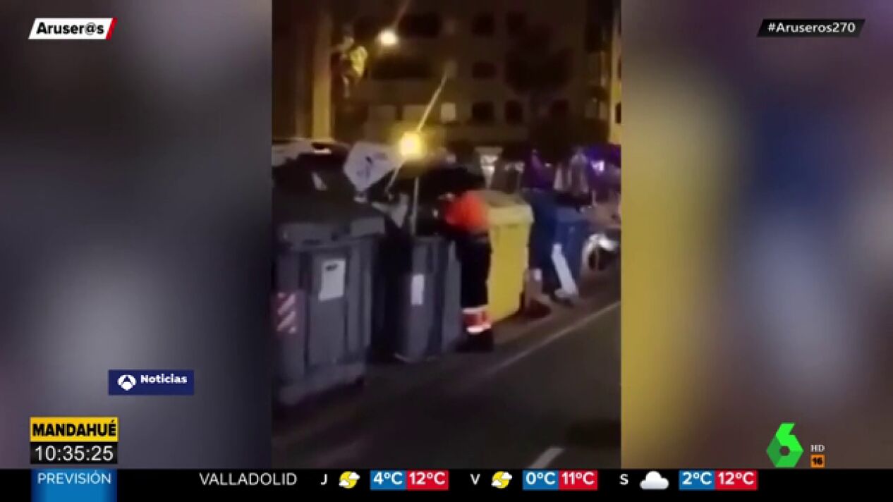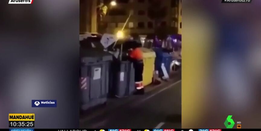 Las personas encargadas de capturar el hecho le amenazan con denunciar ante su jefe y ante la Policía ya que no es un hecho aislado y ha sido 'pillado' en otras ocasiones tirando a la basura el esfuerzo que hacen los vecinos por reciclar.