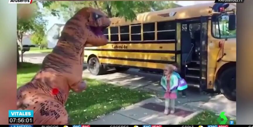 No hay duda de que esta tía tiene que ser la favorita de sus sobrinos después disfrazarse de dinosaurio para recibir a los pequeños a la llegada del cole. La reacción de los niños al verla es adorable.
