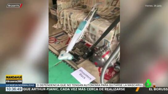 En las imágenes se ve cómo la mujer llega corriendo al garaje para descubrir la 'sorpresa' que le ha preparado su marido. Cuando abre el ventanal, que tiene un improvisado cartel como si fuera un gimnasio de 24 horas, se pueden ver, colocados alrededor de la habitación, varios aspiradores, rollos de papel, productos de limpieza y un cortacésped. Todo dividido por zonas y con un cartel que le indica para qué es cada utensilio'.