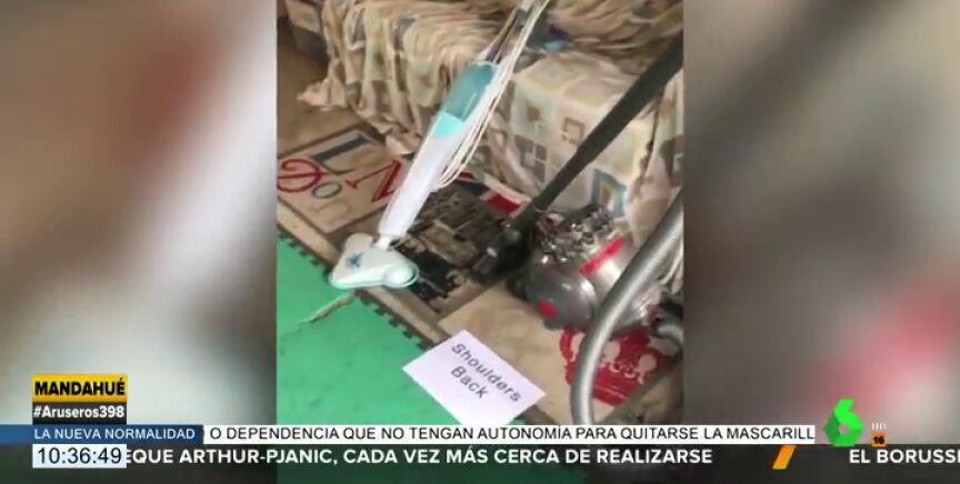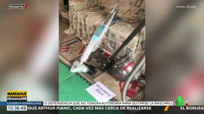Así, este 'personal trainer' de andar por casa le manda un circuito en el que tiene que limpiar los cristales para ejercitar las piernas, pasar la aspiradora para fortalecer los glúteos y para tonificar todo el cuerpo, pasar el cortacésped. "Hay que tener unos huevos...", comenta Alfonso Arús. Una broma de mal gusto en la que también le ha dejado en el 'gimnasio' los cuatro hijos a su cargo.