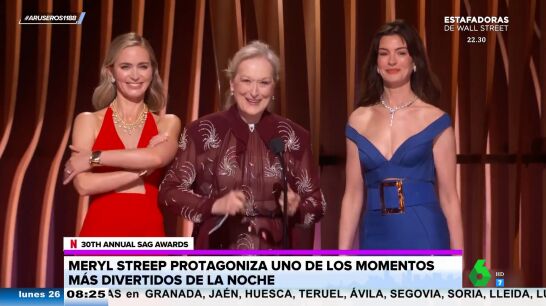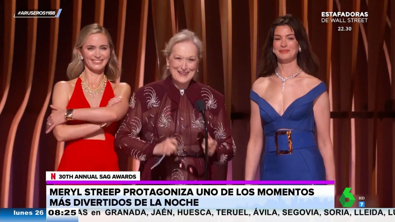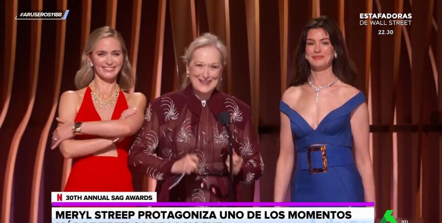 Tatiana Arús enseña en el plató de Aruser@s el momentazo vivido en los SAG Awards 2024 , los premios que dan los Sindicatos de Actores de Hollywood celebrados en Los Ángeles. Meryl Streep subió al escenario para dar el Premio al Mejor Actor Masculino y contó por sorpresa con la ayuda de Emily Blunt y Anne Hathaway.